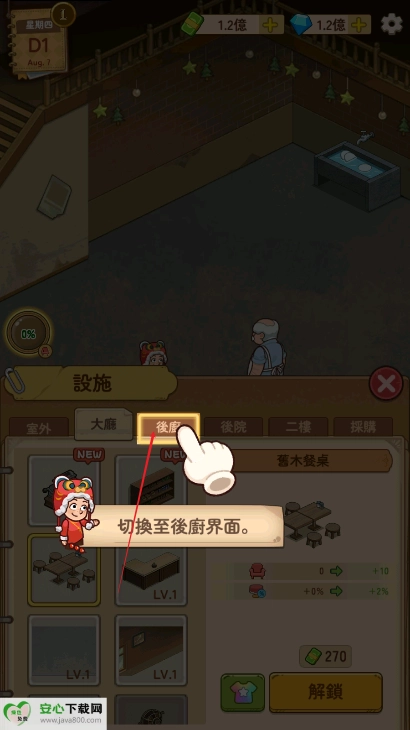 解锁研发功能的条件是店铺口碑达到“街坊熟客”等级,此时厨房会解锁“研发台”,点击该研发台即可进入菜谱开发界面。