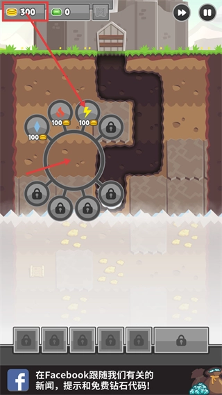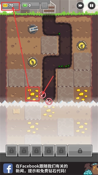 在地下场景里,用铲子挖掘金币资源,同时注意绿色敌人的攻击,要平衡好资源收集和防御操作,攒下的金币可以用来建造后续的塔或者给塔升级。