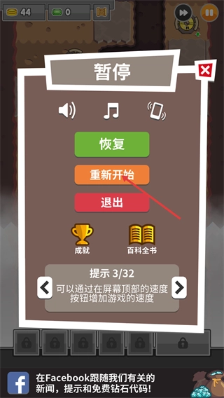 战斗时可以点击暂停界面,从中选择“恢复”以继续游戏、“重新开始”来重玩当前关卡,或者选择“退出”返回主界面。