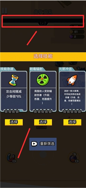 当上方进度条加载缓慢时,等级就会提升一级;每提升一级,就会获得一次选择技能的机会。