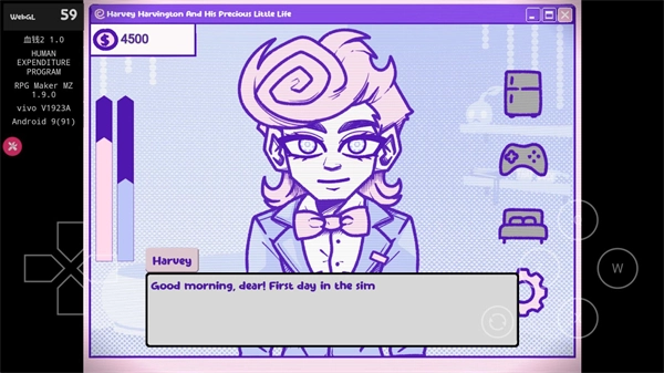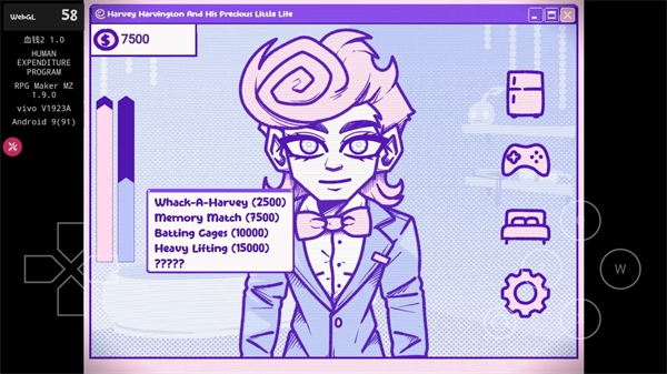 屏幕左侧的蓝色条状物代表心情值,玩家能够点击右侧的手柄图标,通过与哈维互动玩游戏来提升心情值。