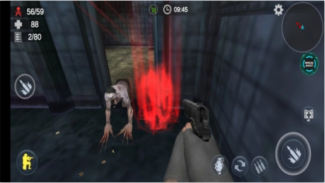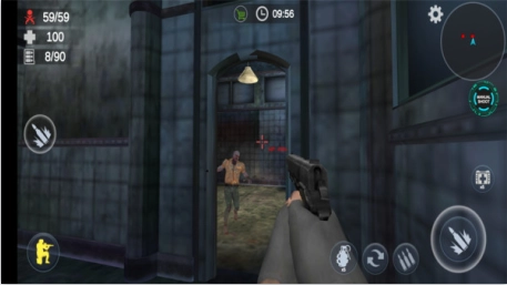 射击简介的右下角设有三个功能按钮:最上方的是装弹键,中间的为射击键,最下方的则是近距离调试键(通过该功能可提升射击精准度)。当瞄准器呈现红色时,即表示已对准僵尸,需立即进行射击。此外,左上角的地图也需留意,一旦出现红色圆点,就意味着有僵尸出现了。