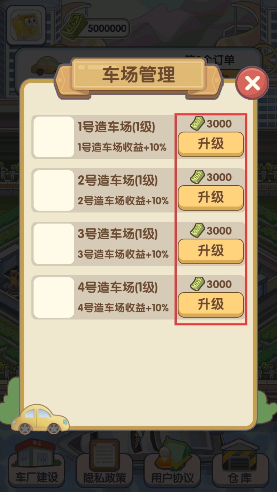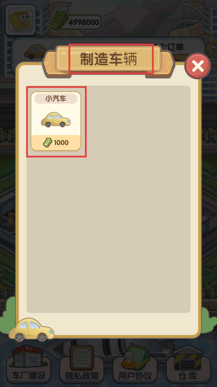 4、于制造车辆的界面,耗费1000金币来制造小汽车,以此补充库存,满足订单所需,进而逐步构建商业帝国。