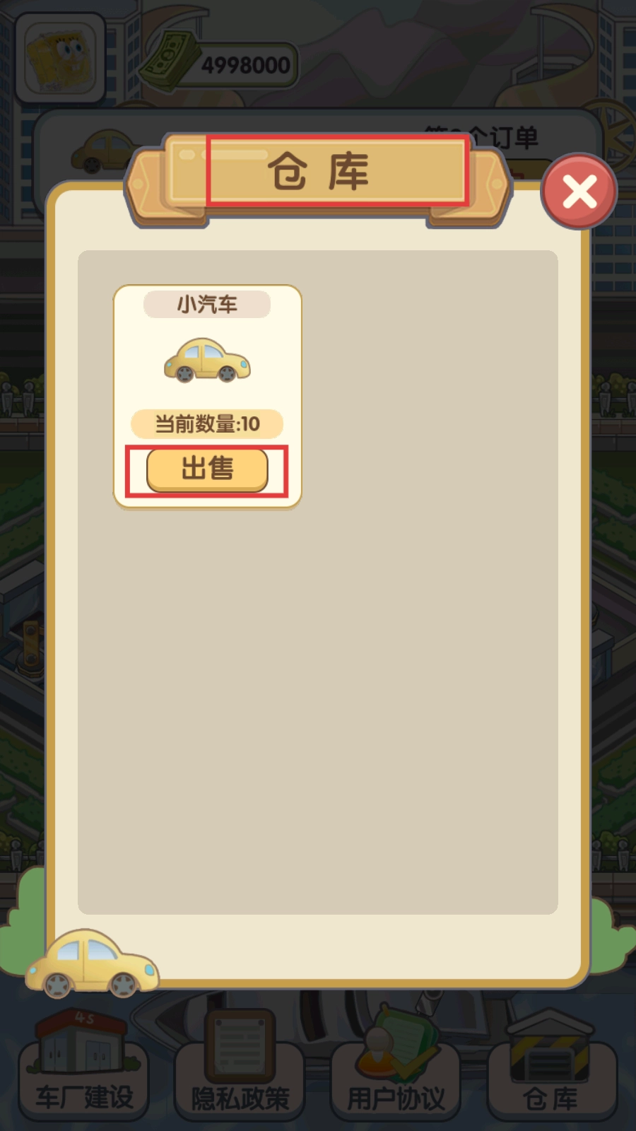 3、当您进入仓库后,如果发现车辆库存较为充足,此时您能够点击【出售】按钮,通过售卖小汽车,迅速获取金币,这些金币可用于后续的发展。