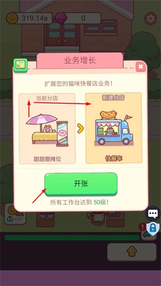 业务拓展界面的操作规则是:当所有工作台等级达到50级时,点击“开张”按钮即可新建分店,进一步扩大猫咪快餐店的经营规模。