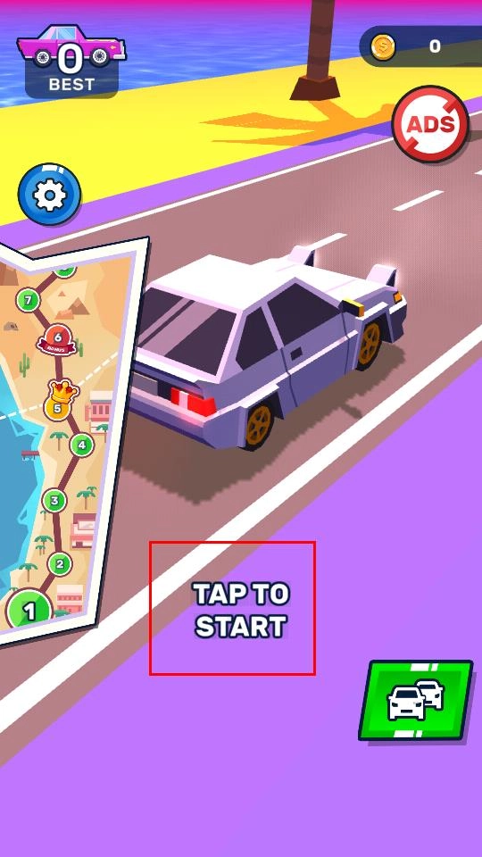 在游戏初始界面点击“TAP TO START”按钮即可启动游戏,左侧地图会呈现关卡路线,选定关卡后就能开启赛车挑战,同时初始金币数量也会同步显示。