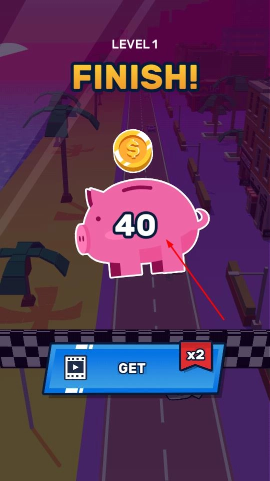 成功通过关卡后,界面会显示“FINISH!”,粉色储蓄罐会展示本次获得的金币数量,点击“GET”按钮即可领取奖励,也可以选择观看广告来让收益翻倍。
