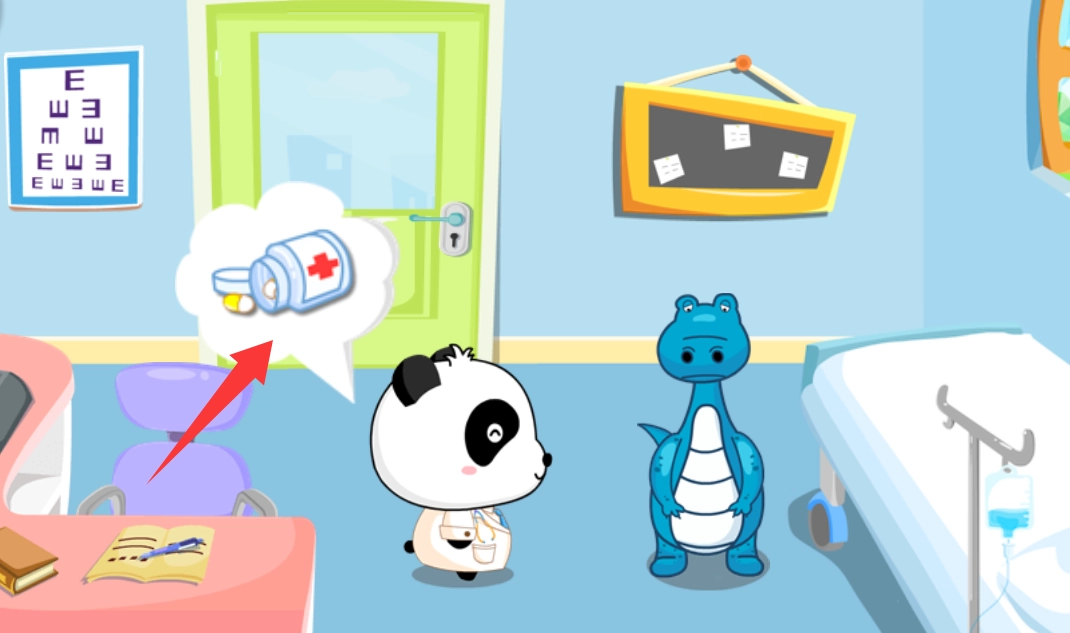 小恐龙吃错东西了,来看医生,点击吃药给他吃。