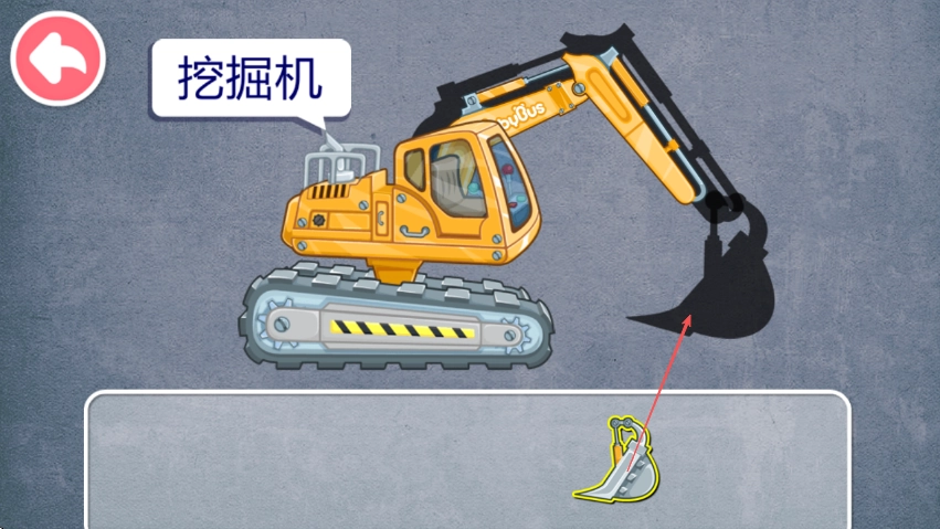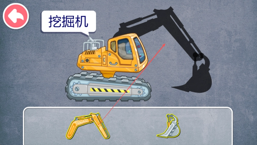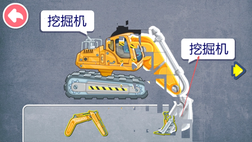 继续观察挖掘机部件的图案,点击部件并拖动到挖掘机相应的阴影位置,以此加深对挖掘机结构的了解。