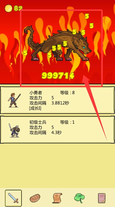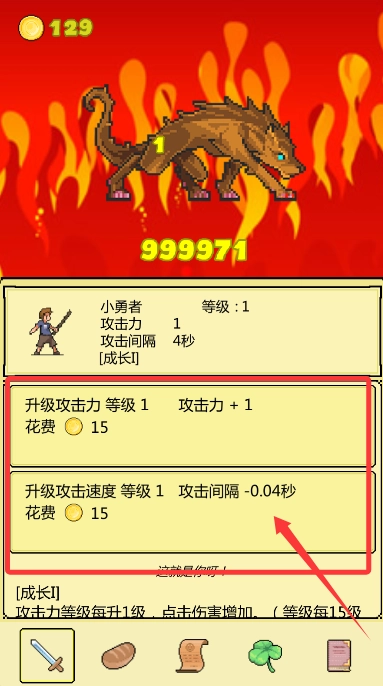 进入游戏后,第一步要给小勇者升级,通过消耗金币来提升他的攻击力或者攻击速度,这样就能增强战斗能力。