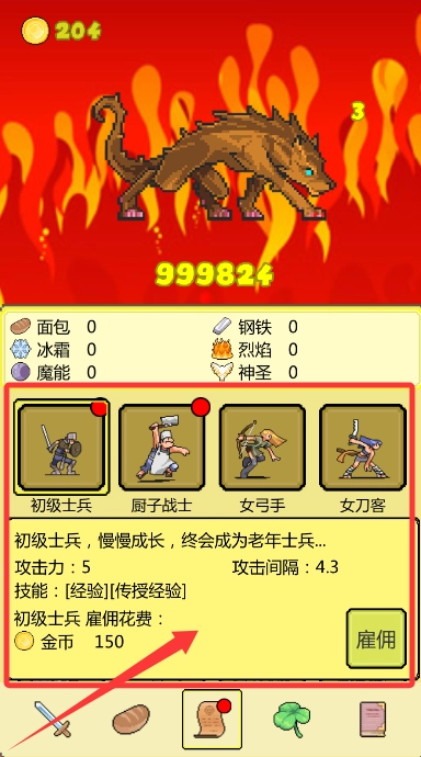 核心玩法为组建雇佣兵团队去挑战巨龙,玩家可点击招募按钮来增加作战单位,这些单位会自动发起攻击,玩家仅需对阵容搭配进行优化即可。