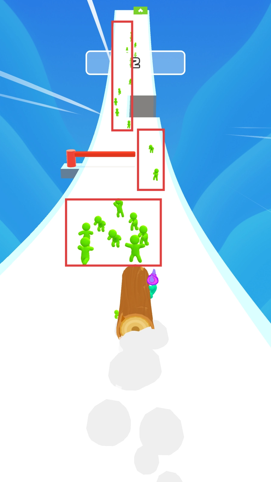 1. 我们控制角色带着木头向下滑行,在这个过程中,要收集绿色小人来扩充队伍,同时务必留意躲开红色机关,始终维持前进的方向。