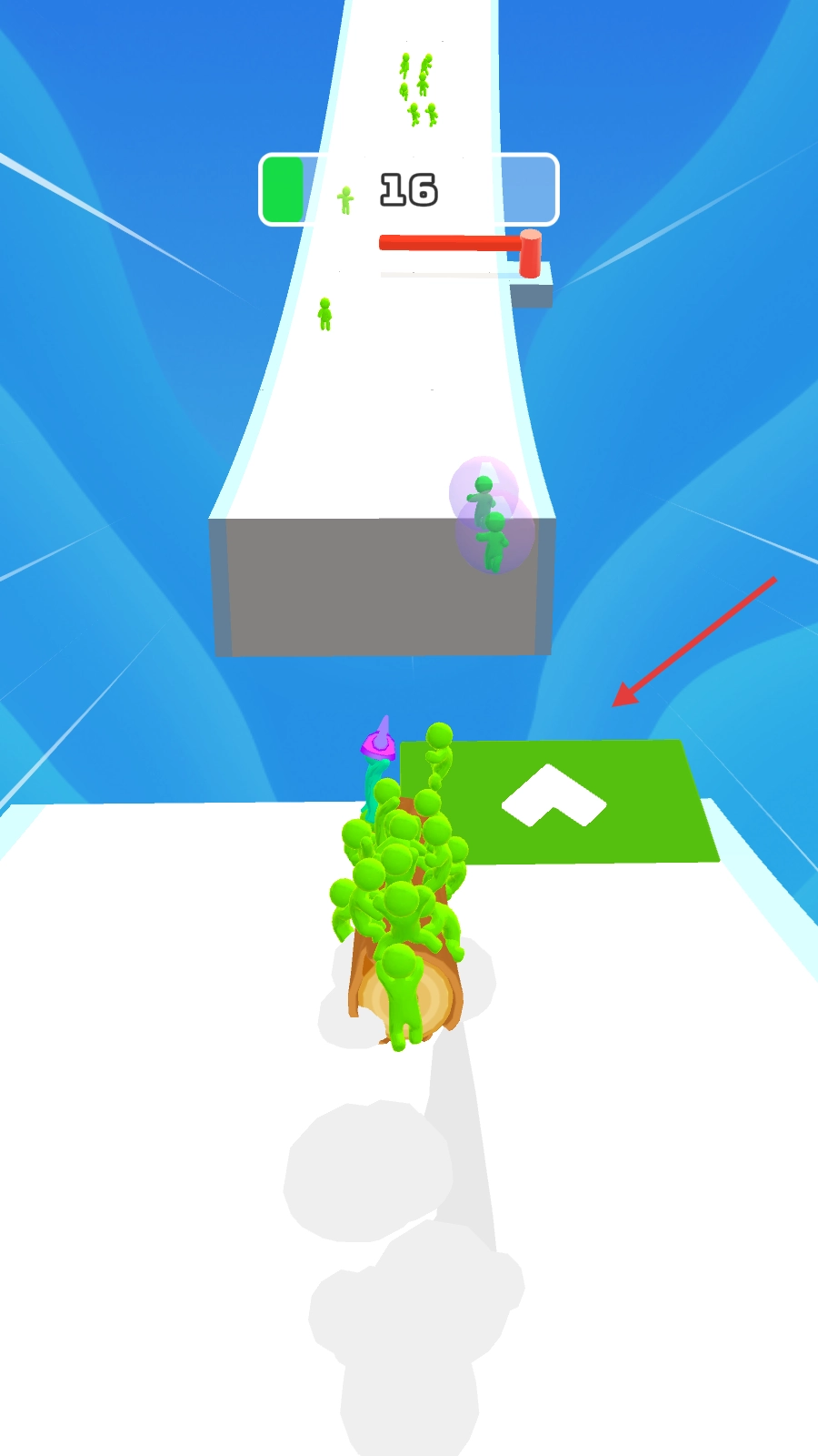 2、当碰到绿色箭头区域时,需精准滑动屏幕进行触碰,如此才能让我们的队伍获得足够动力,顺利跃至对面。