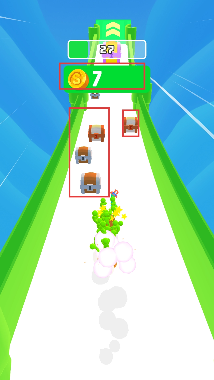 3、抵达绿色赛道后,锁定宝箱并收集,尤其要留意最后那个大宝箱,这样就能赢取更多金币奖励啦。