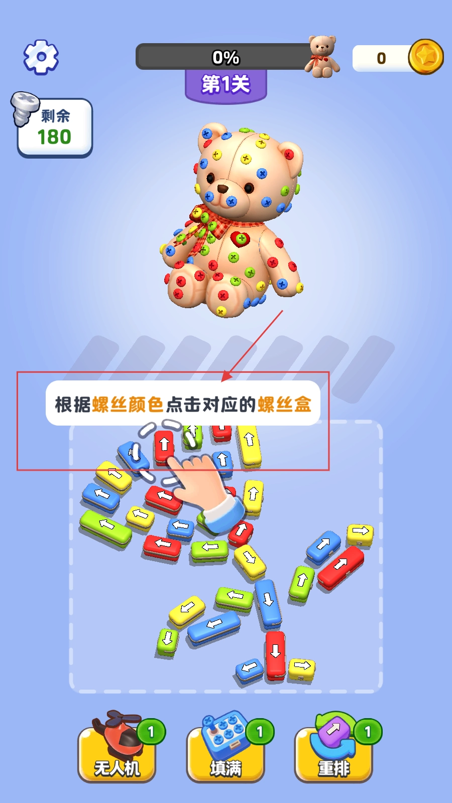 2、在第1关,依照提示,依据螺丝的颜色去点击相应的螺丝盒,以此收集玩具熊所需的螺丝。