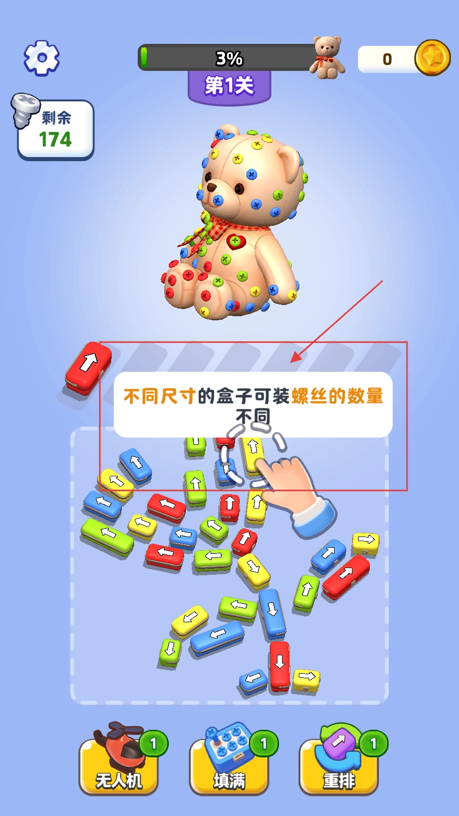 3、留意不同尺寸的盒子所能装下的螺丝数量存在差异,需合理挑选,以顺利完成螺丝收集任务。