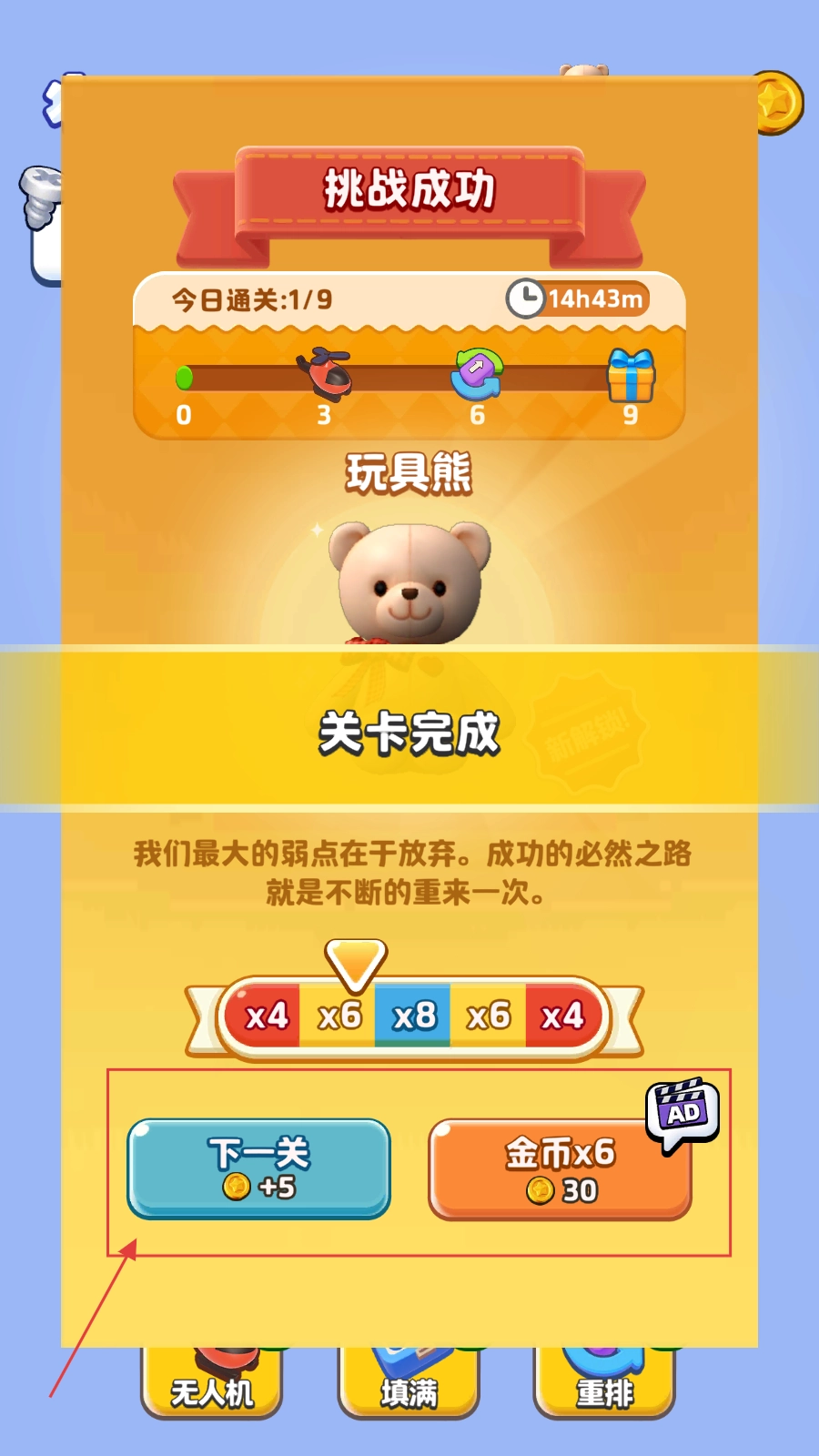 4、成功挑战后,点击【下一关】,开启玩具熊螺丝装配的全新关卡,继续挑战。