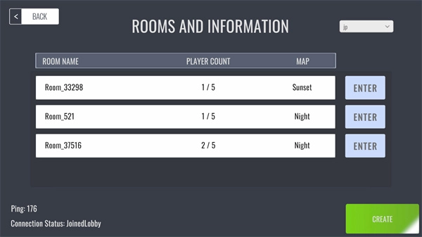 进入后,可以看到很多在线房间,选择右下角的CREATE按钮,也就是创建房间的入口。