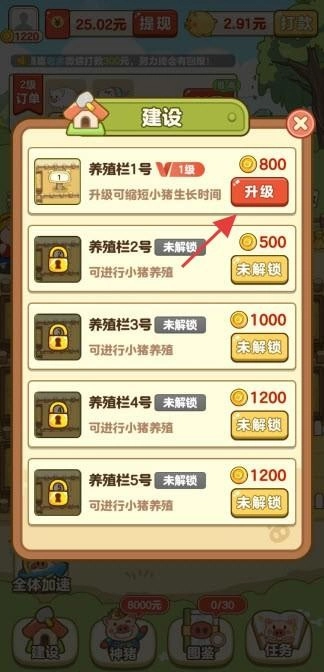 3、在游戏的【建设】界面,玩家可以对养殖栏(比如养殖栏1号)进行升级,以此解锁新的栏位,进而提高养猪场的养猪效率。
