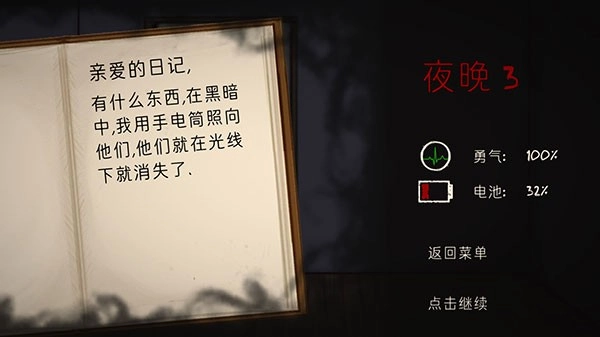 5、每当熬过一个令人恐惧的夜晚,结束后,众人便能查看艾琳娜剩余的勇气值以及电池电量。