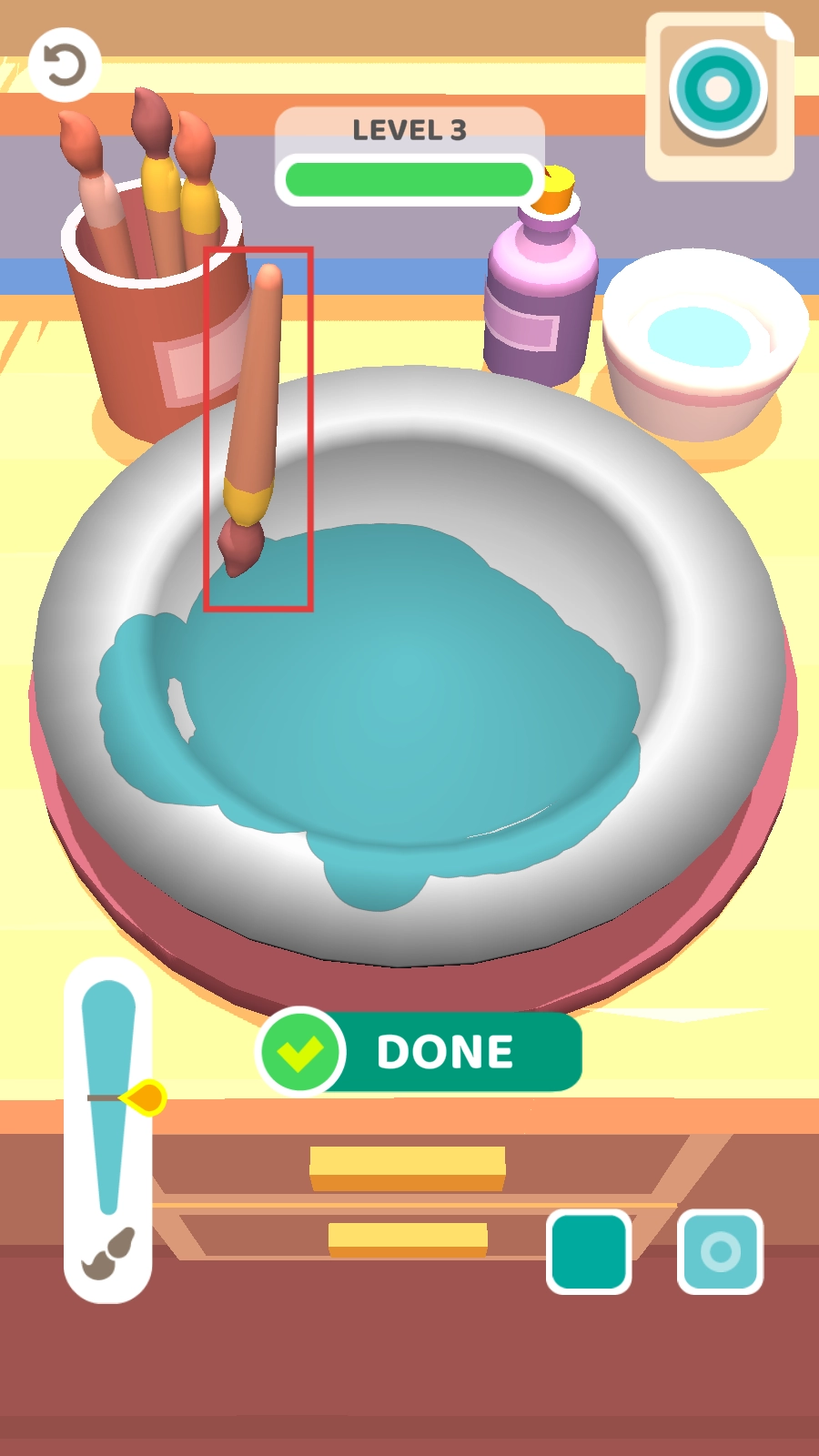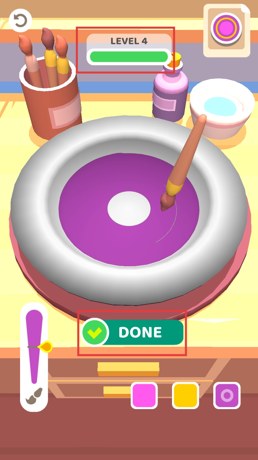 4、来到关卡4,拿起画笔蘸取紫色颜料,依照图案为盘子上色。涂完后点击【DONE】,一个漂亮的盘子就大功告成啦。