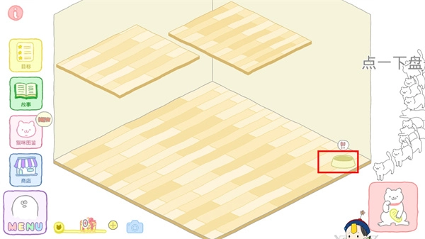 1、第一步,大家进入《猫咪很可爱可我是幽灵》这款游戏。刚进入游戏时,能看到一个猫盆,点击它就能装上猫粮。