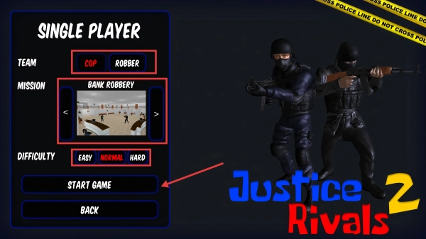 1. 开启游戏后选择阵营,无论是正义警察还是劫匪皆可。接着选取【BANKROBBERY】任务,将难度设定为【NORMAL】,最后点击【STARTGAME】即可开始游玩。