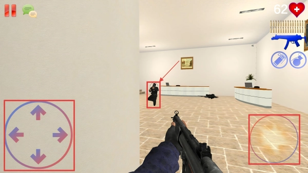 2. 操控左侧摇杆来移动角色展开进攻,当遭遇敌人时,点击射击键进行攻击。躲在掩体后方射击会更为安全,注意别让敌人近身。