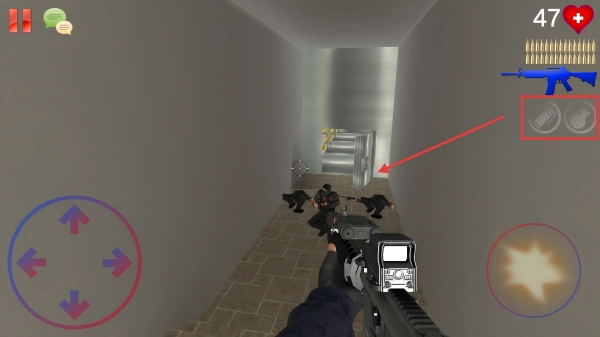 3、当遭遇大批敌人时,点击右侧的手雷、闪光弹图标,扔出这些投掷物来进行清场或者为行动提供掩护。在进攻至金库前方时,将守护的敌人全部消灭。