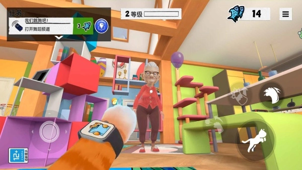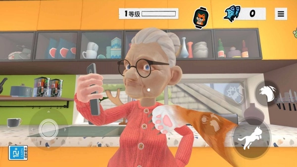 2. 通过操作虚拟摇杆来操控胖猫移动,点击技能按钮实现跳跃、抓挠等动作。