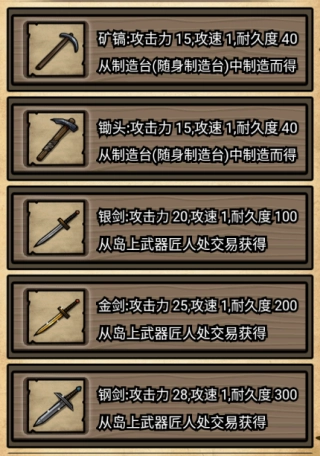 9、矿镐、锄头、银剑、金剑、钢剑;