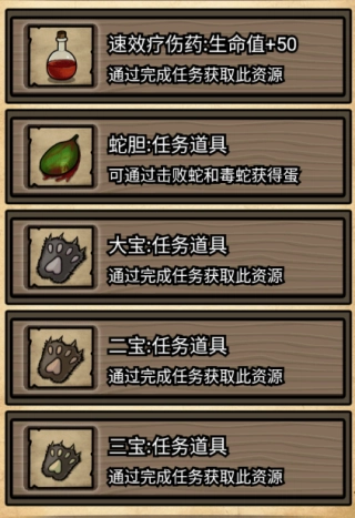 5、速效疗伤药、蛇胆、大宝、二宝、三宝;