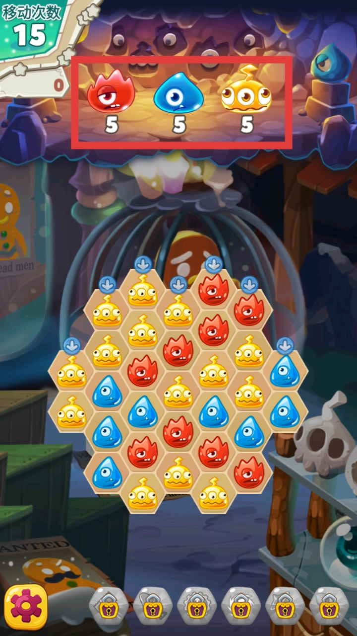 1、注意左上角移动次数,需要再次数用完之前将方框内萌怪进行消灭。
