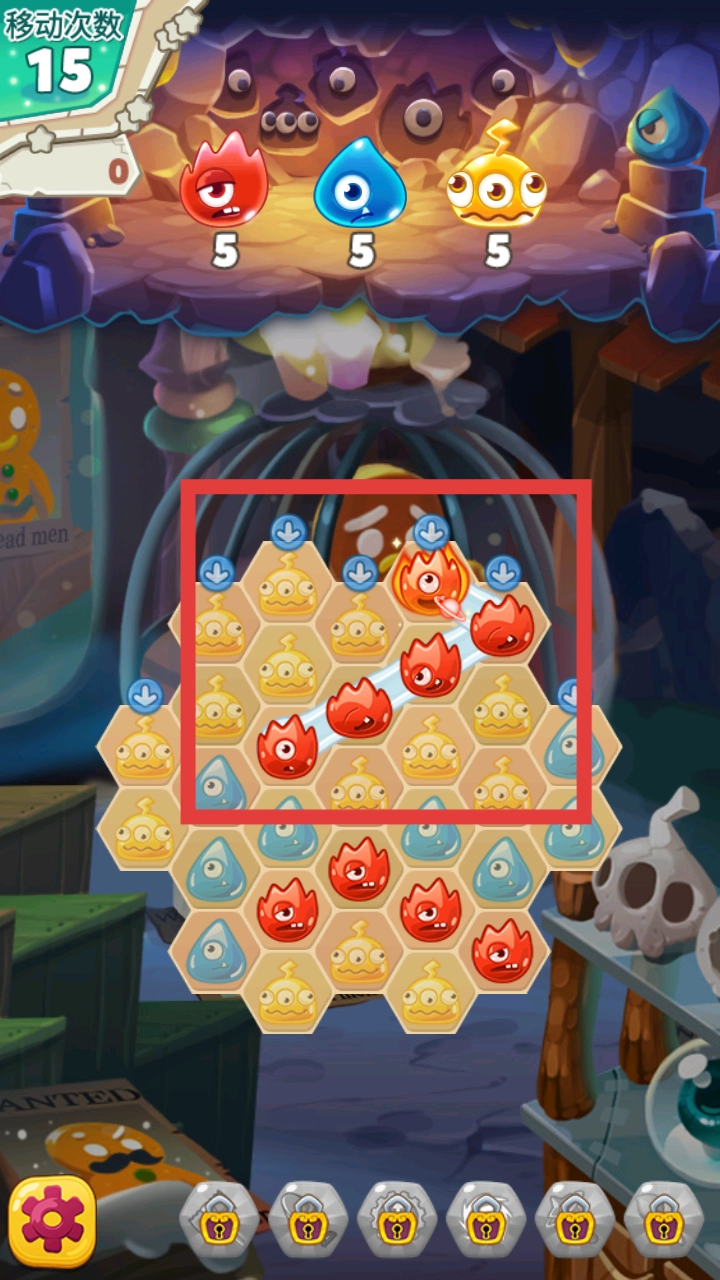 2、通过移动红框内的怪物,将【红色火焰怪物】连成一线,触发消除,减少移动次数同时获取分数。