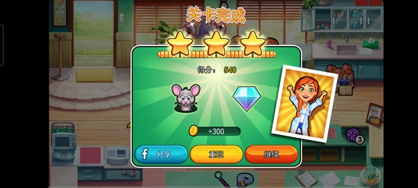 关卡完成后会结算得分、金币以及星星数量,你还可以重新开始这一关卡。