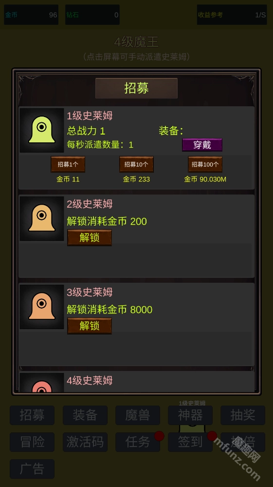 2、史莱姆会自动攻击魔王,也可手动点击屏幕派遣。