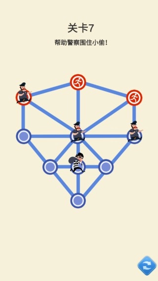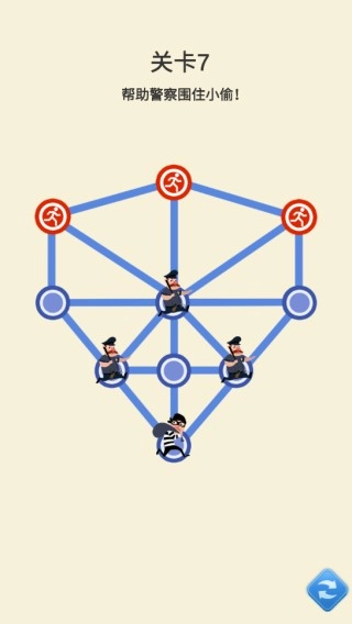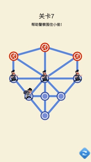 把中间的警察往下挪,把小偷所有的逃跑路线都围住,就能赢了。