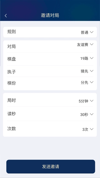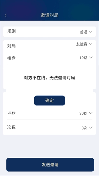 然后再设置对弈规则、对局模式、棋盘路、执子规则、棋份、局时、秒读和次数,最后点击邀请就可以啦!【注:要保证朋友是在线的,不然就无法邀请对局】