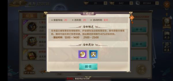 在国探期间完成盗取气运可获得多40%的银两经验奖励双倍经验时间为12:00-14:00;21:00-23:00