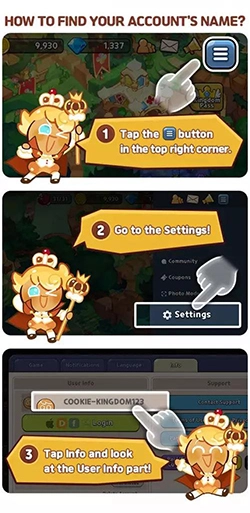 首先,您可以先进入《姜饼人王国》(Cookie Run Kingdom)的设置界面,找到您的 DevPlay ID,接着点击信息选项,再选择“用户信息”。
