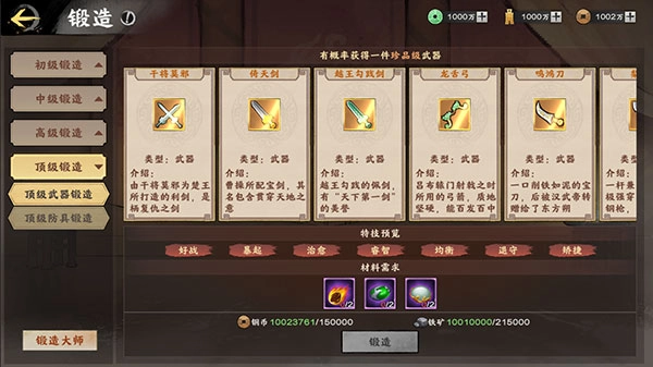 接下来介绍各类装备的获取途径。先看武器与防具:当主城等级提升至6级并开启工坊功能后,可前往工坊界面,消耗基础材料进行武器和防具的打造。