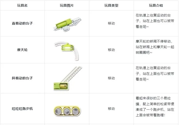 这些玩具按功能特性划分为五种类型:能搭建通道的、设置障碍的、可依附于物体的、具备移动能力的以及通过远程方式操控的。接下来请大家查看下方的图片说明!