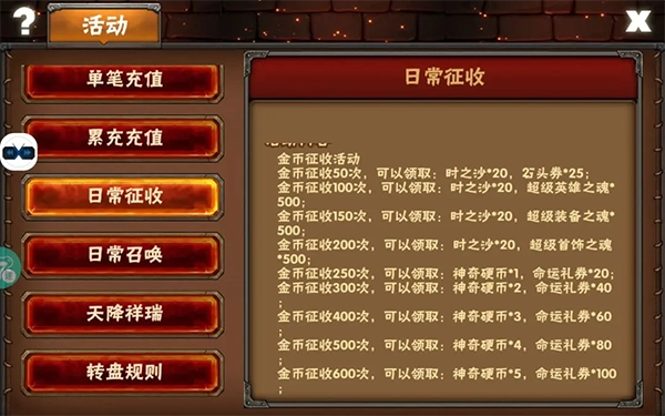 每日进行86次金币征收,持续7天。操作时先逐个点击征收,直到出现需消耗1钻石的提示,再一次性批量征收30次,之后继续单个征收直到总次数达到86次,注意所有次数需累计计算避免出错。按此方式操作可领取全部征收奖励,获得的福袋有几率开出钻石,VIP等级较高的玩家能以较低成本获取金币、硬币等各类材料。