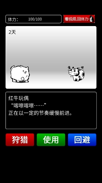 玩偶:袋鼠竹轮:食蚁兽炮竹:熊【划重点】使用道具后,可以顺利通关,但是无法获得该图鉴。3、有一大波关卡,是没有任何道具可以克制的。第一局懵逼的活过5天 ,知道了什么蝴蝶,蚯蚓啥的好欺负,然后发现有时候好欺负的也会把自己搞死,然后就稳如 old dog的慢慢来,看看吃东西后给的那些物品,有了一些门道后勉强活过了十几天,但总是会要钱的时候没钱,要辟邪符的时候没有辟邪符等等。之后就是一局一局的看脸玩了,有时候第一天就被企鹅搞死了,有时候能活过15,16天,到了刚才活了20天就开心的不得了。狩猎是有几率的,只要你用道具打败了一次的怪,你狩猎它就有几率成功。狩猎一次加10点行动力,用道具过不加行动力,撤退逃跑消耗自身30点行动力。