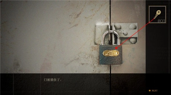 7、往右边行走至大门位置,对大门展开调查,接着用钥匙开启门锁。