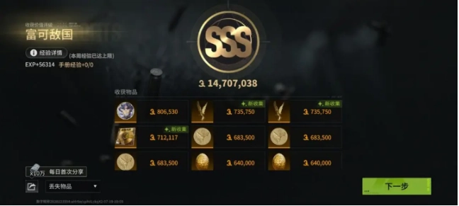 第一波开始造成伤害的风暴能用针剂或药品扛过去,后续的风暴掉分会变得特别快,得频繁打药,不太建议硬扛太久。运气好的话单人能带着两千万撤离,运气差的话就像我这把一样,大概只有一千四百万左右。