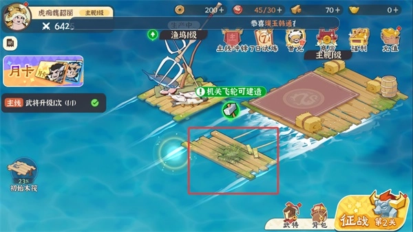 建造浮城地块:点击水面空白区域就能建造地块,地块的数量直接影响上阵武将的数量,前期要尽可能多建造,每新增一个建筑都能增强角色的属性。