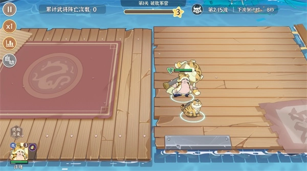 许褚是核心角色,他每隔60秒就能召唤出一只铁甲虎,再搭配上其他可以召唤士兵或兽类的武将,就能迅速形成人海战术。