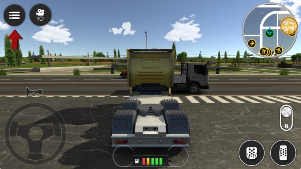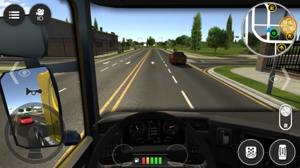 转向操作可通过左侧的虚拟方向盘来控制,右侧的踏板则分别对应加速和制动功能,按下R键即可切换至倒车模式。