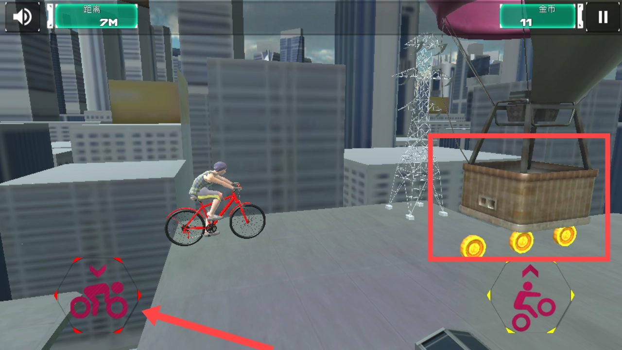 3、踏入游戏关卡,借助屏幕左下角的虚拟按钮来躲避热气球,同时收集像红框内所显示的金币。